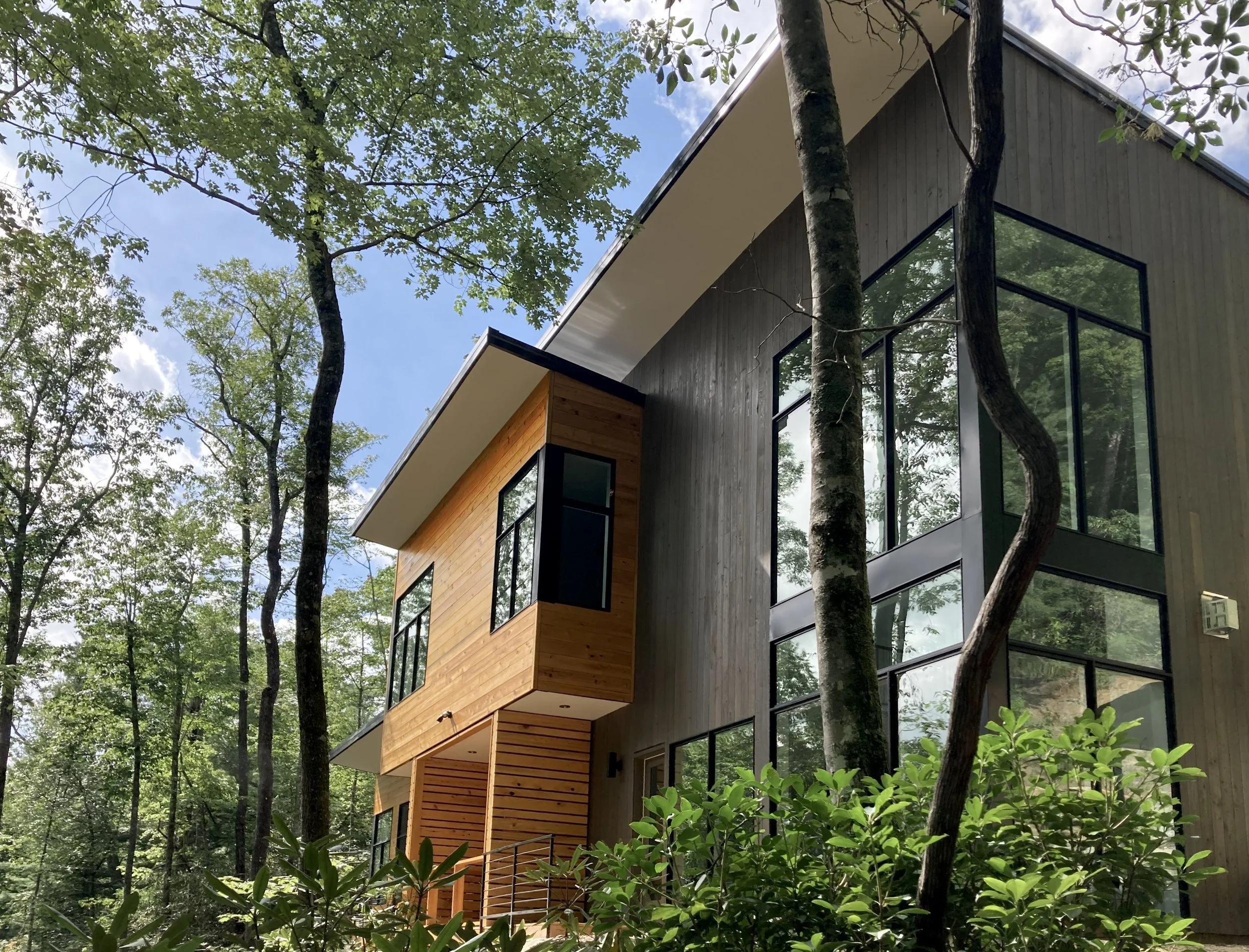 The living wing is clad in a vertical cypress rainscreen. The master wing is clad in horizontal ship-lap cedar. Low-sloping shed roofs let south-facing light in and open up the interior spaces to the densely wooded ravine and view of the falls.